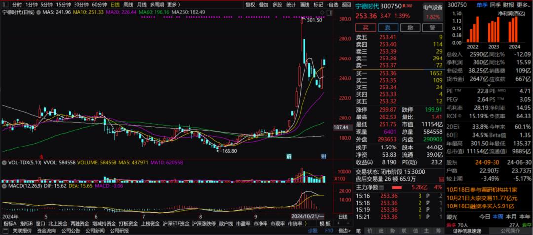 按照三个季度360亿元的净利润,宁德时代平均日赚超1.3亿元。此外,在这轮A股反弹行情下,根据10月21日收盘价253.36元的数据,宁德时代市值超万亿达1.1154万亿元,股价看起来不错。