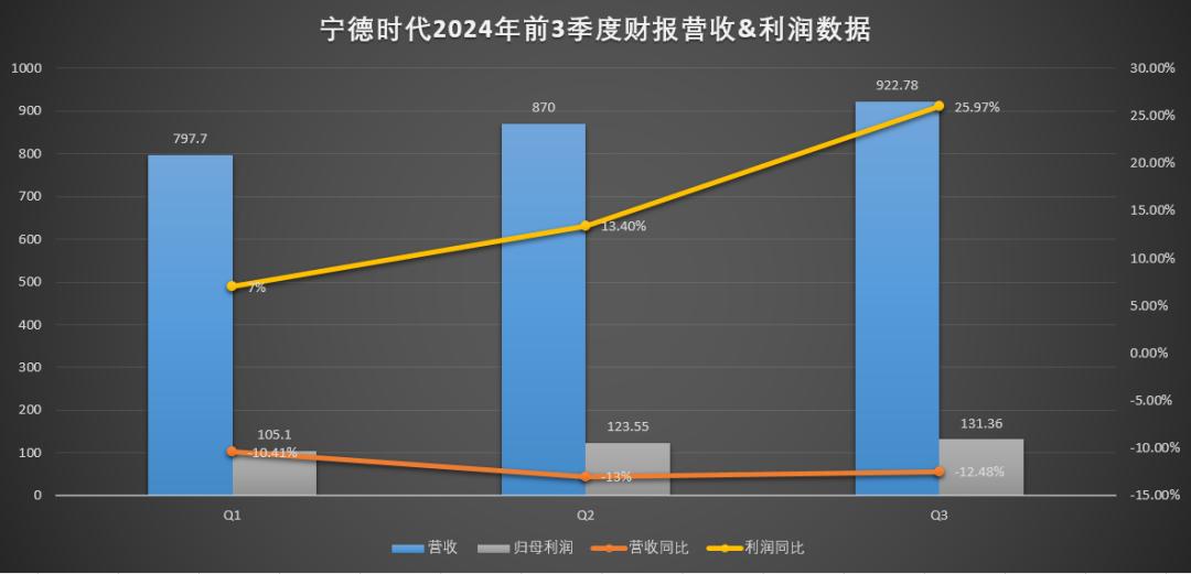 10月18日晚,宁德时代发布了2024年三季报。根据财报,今年第三季度,宁德时代营业收入为922.78亿元,同比减少12.48%。但是,净利润则为131.36亿元,同比增长25.97%,超过市场预期。