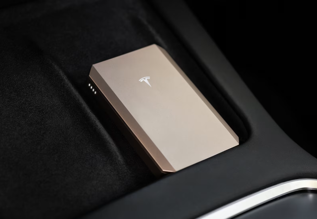 这款充电器还是一款充电宝,自带 5000mAh 电池,配有 USB-C 有线输入输出接口,还能放在特斯拉汽车的无线充电板上为自身充电。