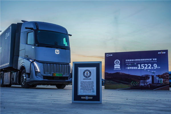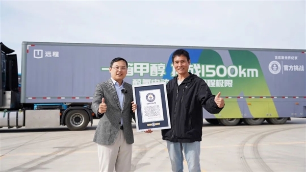 该车从甘肃武威到新疆吐鲁番,仅靠一箱绿色甲醇穿越河西走廊,达成1522.9公里行驶里程,获得“半挂式混合动力卡车单次加满绿色甲醇燃料行驶最远距离”荣誉。