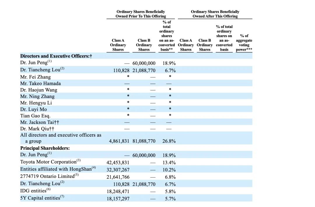 剖析股权结构,招股书披露,IPO前小马智行的第一大股东为彭军,持股比例为18.9%,而丰田作为第二大股东,持股比例为13.4%。在外部投资股东中,红杉中国通过其旗下基金累计持有小马智行10.2%的股份,位居第三大股东。