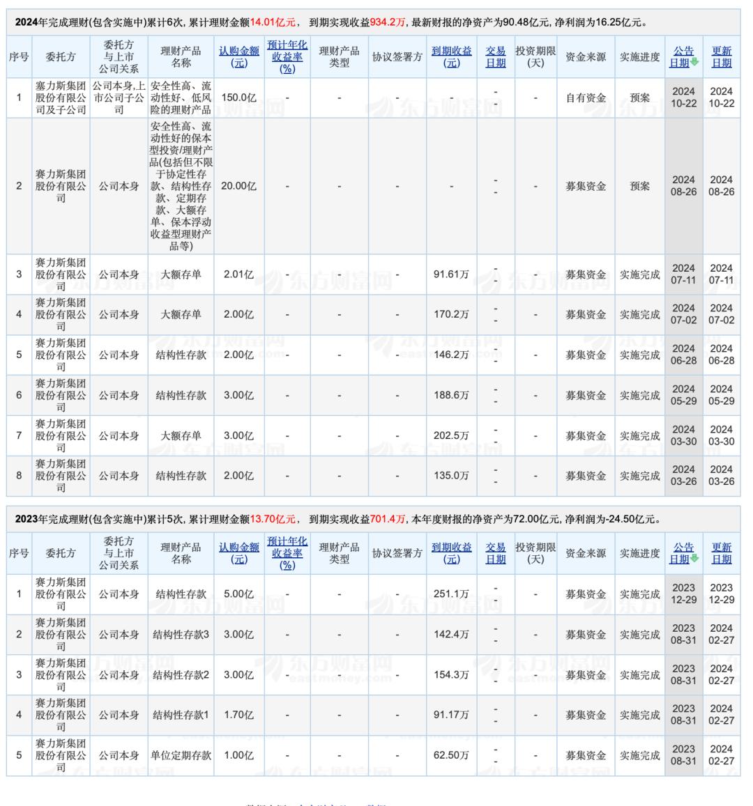去年8月,赛力斯就曾斥资20亿元理财,期限为12个月。
