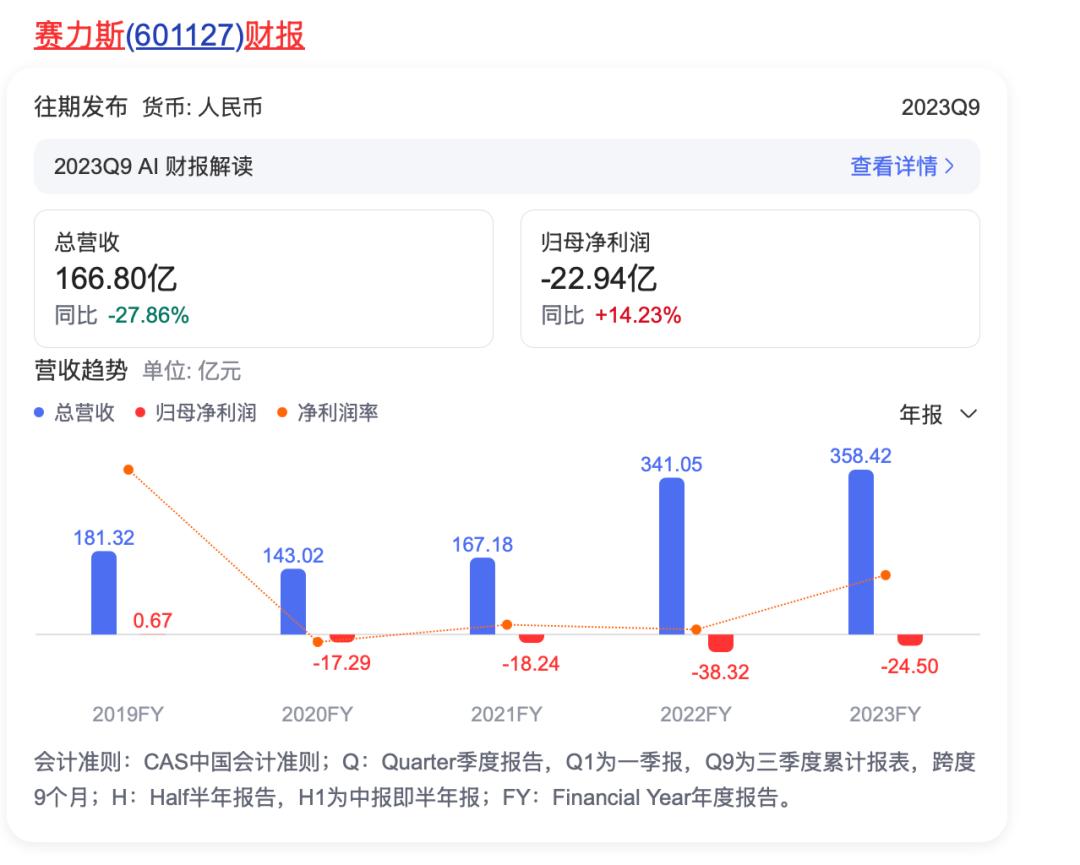 其中2022年,赛力斯净亏损更是高达38.32亿元,创下新高。2023年,公司亏损有所下降,但仍高达24.50亿元。