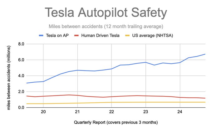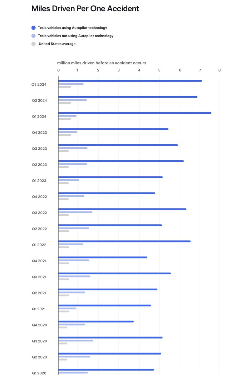 IT之家注意到,特斯拉安全记录在过去几个季度一直保持稳定,虽然在 2024 年第四季度特斯拉使用 Autopilot 技术的车辆每行驶 539 万英里发生一次事故,但这一数据是在冬季记录的,当时的驾驶条件并不理想。