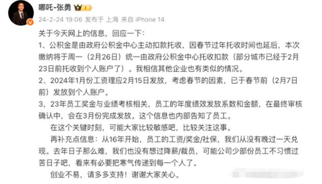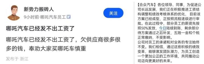 哪吒汽车倒是立即作出回应:公司一线人员工资已发放,中层和高管在做股权优化和薪资架构调整,IPO前要确权,因此部分工资发放稍慢。