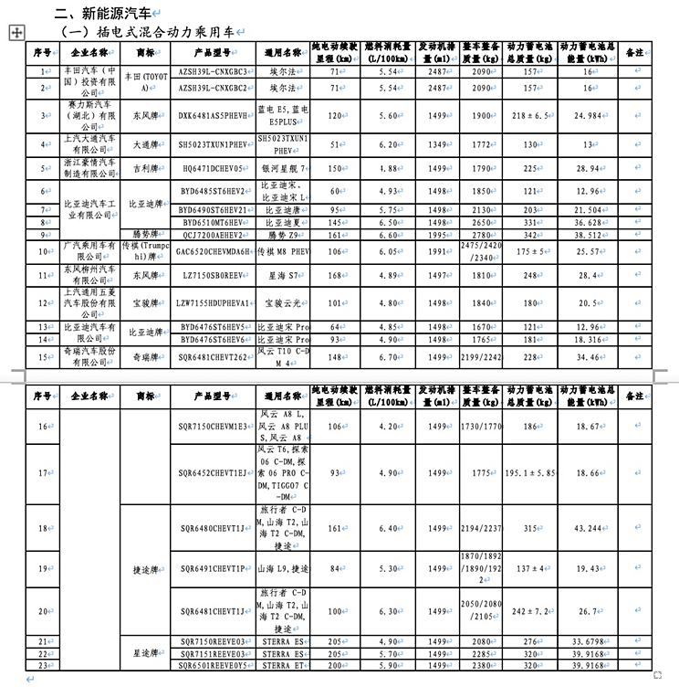 再来看看《享受车船税减免优惠的节约能源 使用新能源汽车车型目录(第六十六批)》,首先我们看到了吉利银河星舰7,这款车型虽然与银河家族之前的命名不同,但仍为一款插混车型,纯电续航150km,搭载1.5L发动机。之后我们看到了大家关注度比较高的比亚迪夏,一款插混MPV,纯电续航145km,搭载1.5T发动机。宝骏中大型插混轿车云光也上榜了,它的纯电续航是101km,搭载1.5T发动机。最后是奇瑞风云A8L C-DM,纯电续航106km,搭载1.5T发动机。(文/汽车之家 秦超)
