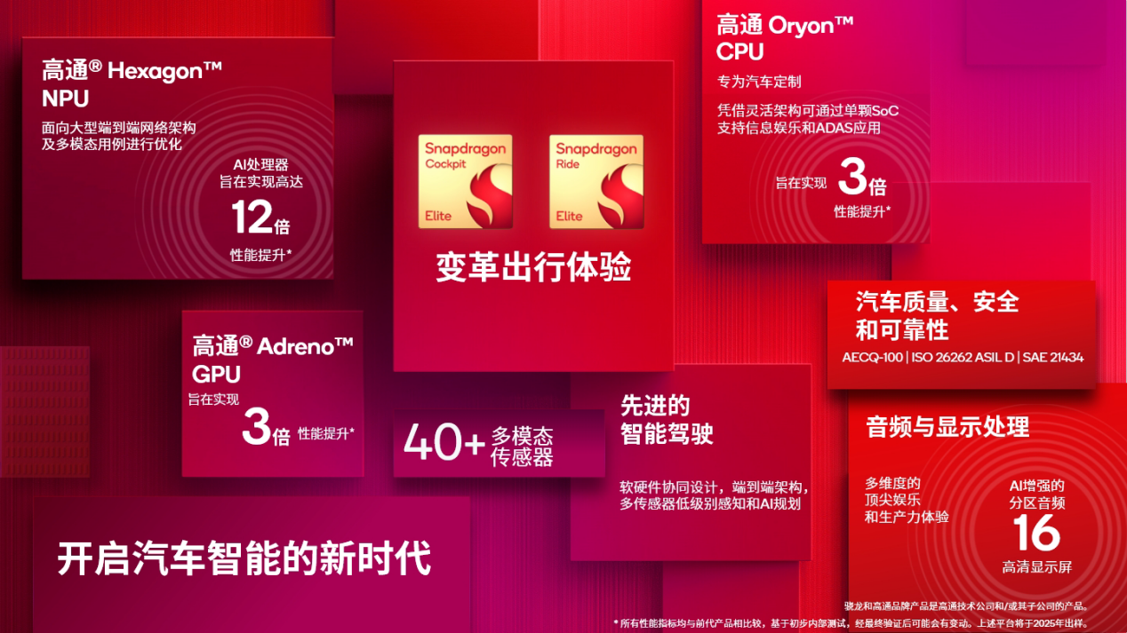 美国夏威夷时间10月22日,在2024高通骁龙技术峰会上,高通新一代的骁龙座舱至尊版平台和Snapdragon Ride至尊版平台首次亮相。在专为汽车定制的Oryon CPU的助力下,骁龙新一代智驾和座舱平台性能同样大幅跃进,CPU、GPU性能提升3倍,AI能力提升12倍。上述两款平台将于2025年出样,会上,梅赛德斯奔驰以及理想汽车宣布将在其未来的量产车型中采用骁龙至尊版汽车平台。