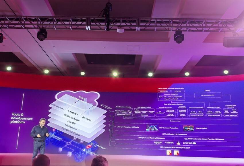 而这次发布会,也几乎全面展示了高通在汽车领域丰富的产品组合,既有SoC和工具,也有完整软件栈,涵盖了硬件、软件(包括中间件和其他应用程序)、云平台、以及利用AI SDK打造完整的全栈。