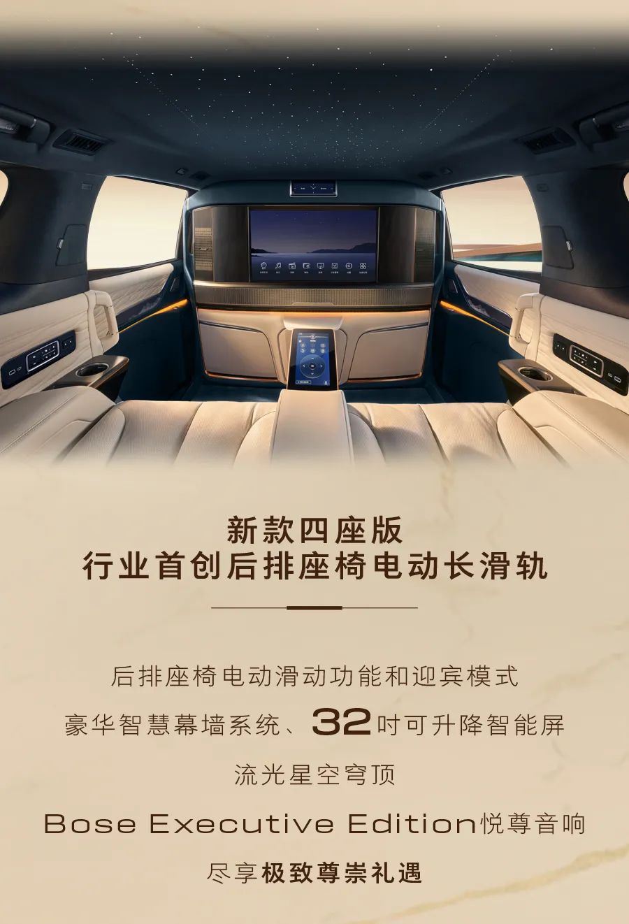 此外,新款四座版车型配备了同样是“行业首创”的后排座椅电动长滑轨,后排座椅支持电动滑动、迎宾模式。后排座舱内还配有豪华智慧幕墙系统,包含 32 英寸可升降智能屏、流光星空穹顶,以及 Bose Executive Edition 悦尊音响。