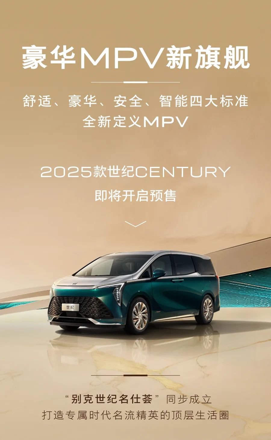 IT之家 10 月 23 日消息,别克汽车今天宣布,2025 款世纪 CENTURY 豪华 MPV 即将开启预售。该车配备全新自研“云感礼宾座椅”,提供 6 座 / 7 座、4 座等不同车型。