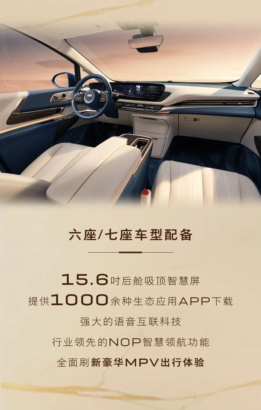 据介绍,该车座椅实现“业界首次”12 层座椅结构,内胆采用超柔珍珠棉、Surflex 慢回弹等多种新材质。六座 / 七座车型配备 15.6 英寸后舱吸顶智慧屏,提供 1000 余种生态应用 App 下载,同时还配备有 NOP 智慧领航(辅助驾驶)功能。