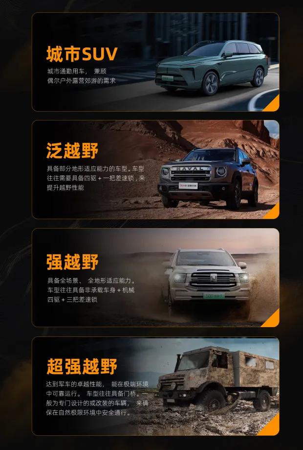 那就是越野有分级,除了泛越野之外,坦克还把车型划分成了城市SUV、强越野和超强越野。