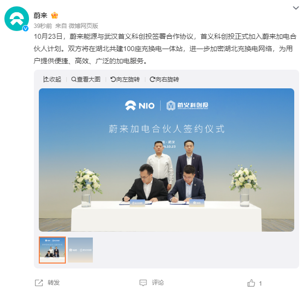 今日,蔚来首个百站合作正式宣布签约,将联合武汉首义科创投共同在湖北共建 100 座充换电一体站。