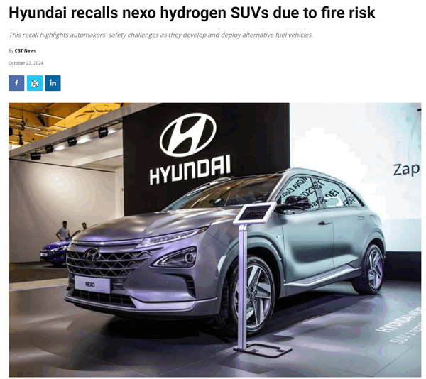 此次召回的车型为2019至2024款现代Nexo车型,这也是美国主流市场上首批氢动力车型。