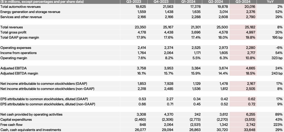 在2024年的前两个季度,特斯拉的净利润遭遇了不同程度的下降。然而,第三季度,公司实现了21.67亿美元的净利润,较去年同期的18.53亿美元同比增长了17%。此外,公司的每股收益也从去年同期的0.53美元增长了17%,达到0.62美元。不按照美国通用会计准则,特斯拉第三季度的净利润为25.05亿美元,较去年同期的23.18亿美元增长了8%;每股收益为0.72美元,较去年同期的0.66美元增长了9%。特斯拉第三季度的利润超出了华尔街的预期,主要得益于出售碳信用额。通过向其他汽车制造商出售碳信用额度,特斯拉在第三季度获得了7.39亿美元的净利润。