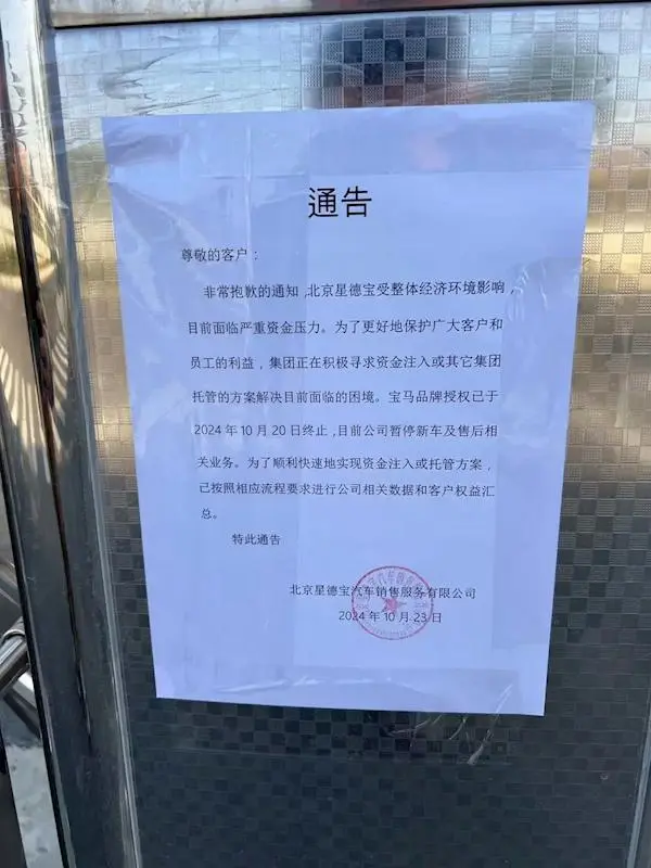 IT之家 10 月 24 日消息,据三言科技报道,宝马全球首家“5S 店”北京星德宝 23 日发布通告称,受整体经济环境影响,目前面临严重资金压力,公司正在寻求资金注入或集团托管,而宝马品牌授权已于 10 月 20 日终止,目前新车销售和售后业务均已暂停。