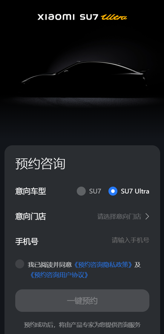 小米 SU7 Ultra 量产版现已在小米汽车官网开启预约,用户可选择意向门店,不过未透露更多信息。
