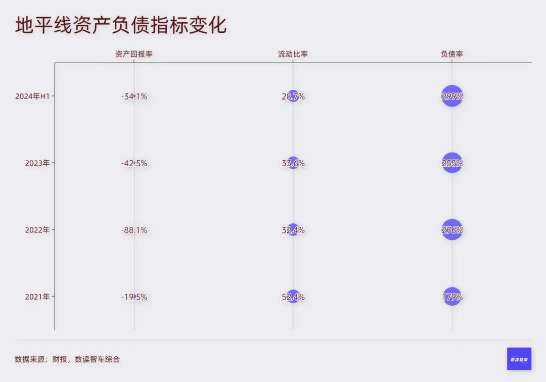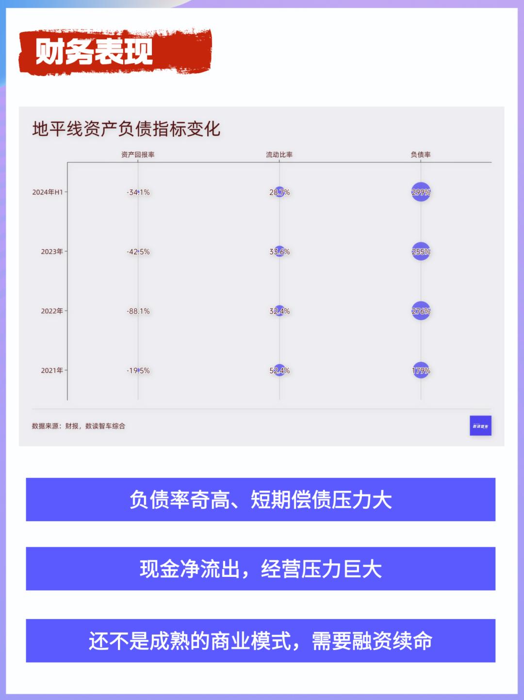 这种情况下,地平线必须融钱续命。因为,一方面,地平线的资产149.5亿,负债447.7亿,资产负债率非常离谱。另一方面,亏损在持续,现金也处于持续净流出状态今年上半年又流出了7亿。截至6月底的流动比率只有28.7%,唯一值得倚仗的就是104.5亿现金及等价物。地平线几乎没什么抗风险能力。