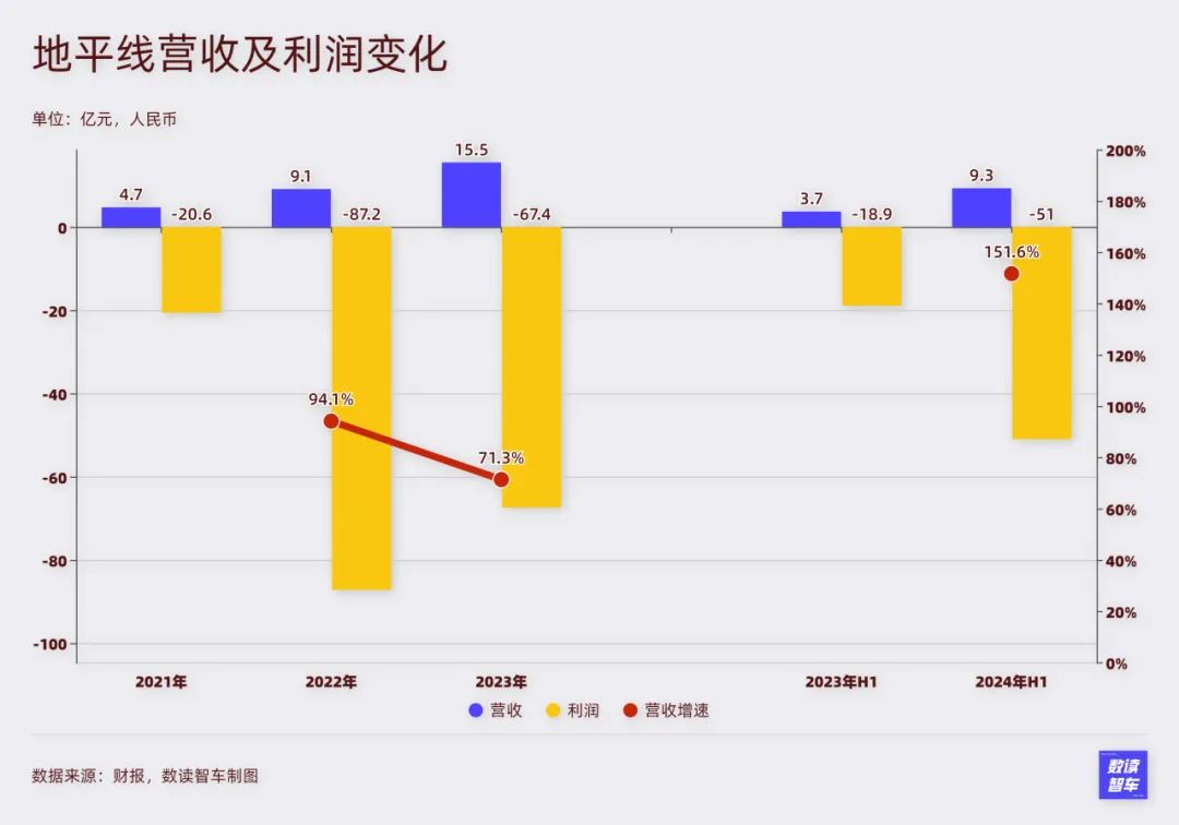 高增长是地平线的一大特征,可能也是地平线唯一能拿得出手的指标。按照年度,2021、2022、2023年营收分别为4.67亿、9.06亿、15.52亿。今年上半年营收9.35亿,比去年同期增长152%,2024年度预计营收可以超过20亿元。