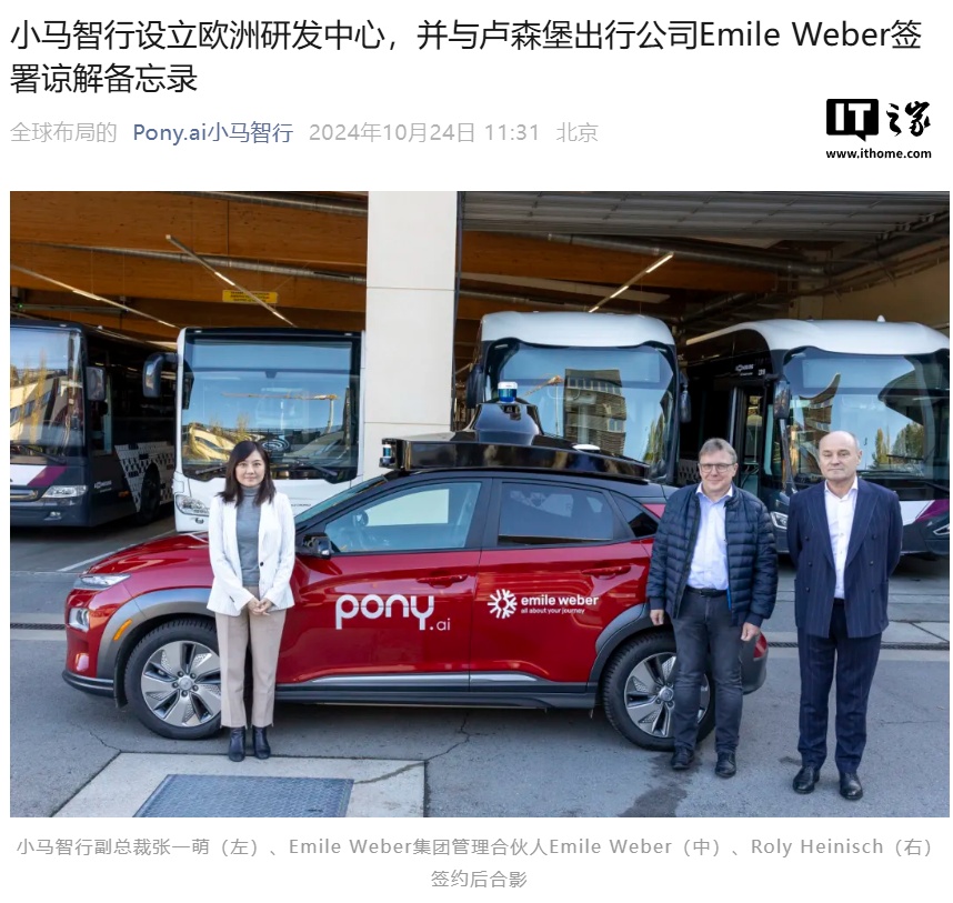 IT之家 10 月 24 日消息,卢森堡大公国当地时间 10 月 23 日,小马智行与卢森堡出行公司 Emile Weber 签署合作谅解备忘录(MoU),双方将合作推动自动驾驶车辆及技术在卢森堡的研发和部署。