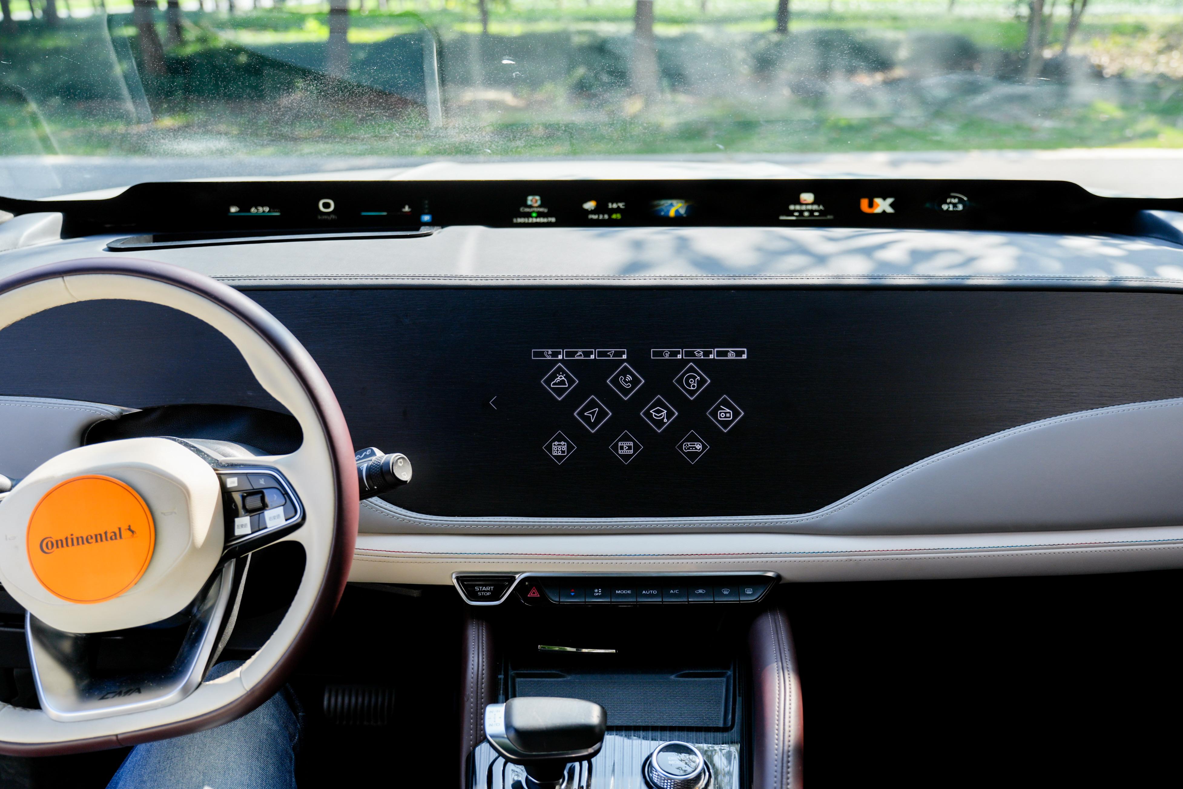 大陆集团还展示了由本土研发团队打造的用户体验演示车,这辆演示车展示了大陆集团新研发的全景式抬头显示器、大视野变焦式增强现实抬头显示器和睿隐显示(In2visible Display)技术。这套座舱显示技术能替代传统的仪表、中控与副驾屏幕,能给座舱内饰设计带来更高的自由度。
