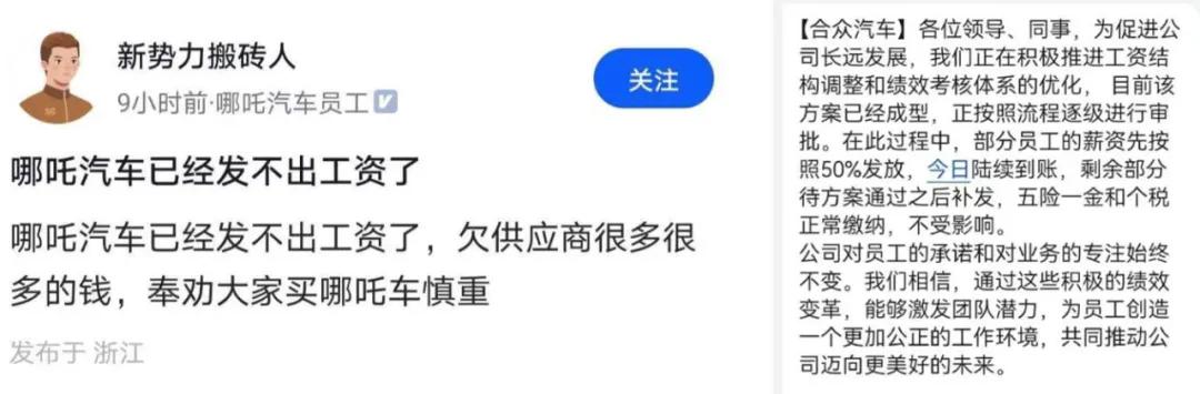 21世纪商业评论的报道显示,哪吒汽车母公司合众汽车群发短信称,公司正在调整工资结构和优化绩效考核体系,方案尚在审批,部分员工的薪资,先按50%发放,方案通过之后补发剩余部分工资。