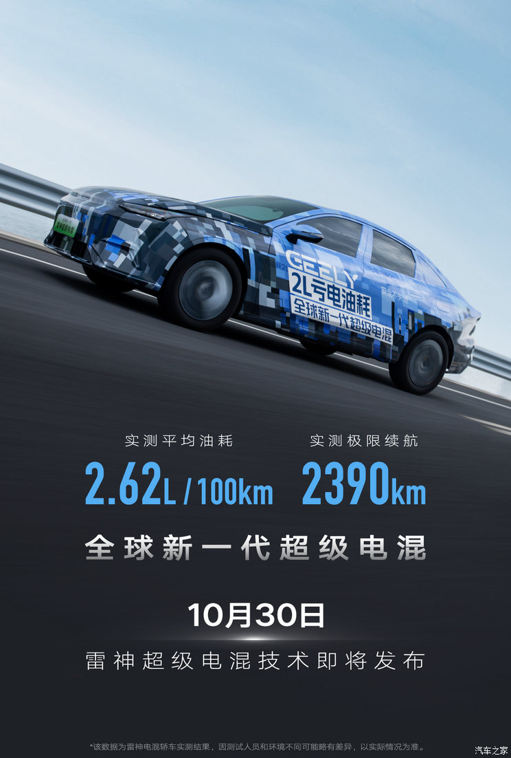 [汽车之家 资讯] 近日,我们从官方获悉,吉利汽车将于10月30日正式发布热效率突破46%的新一代雷神超级电混。据悉,搭载新一代雷神超级电混的轿车在极限工况下,百公里油耗为2.62L,满油满电续航可达2390km。此前,吉利还申请了全新混动安全技术专利,有效提升混动车辆在长时间高速行驶下的安全可靠性。该技术也将在新一代雷神超级电混系统上集中应用。