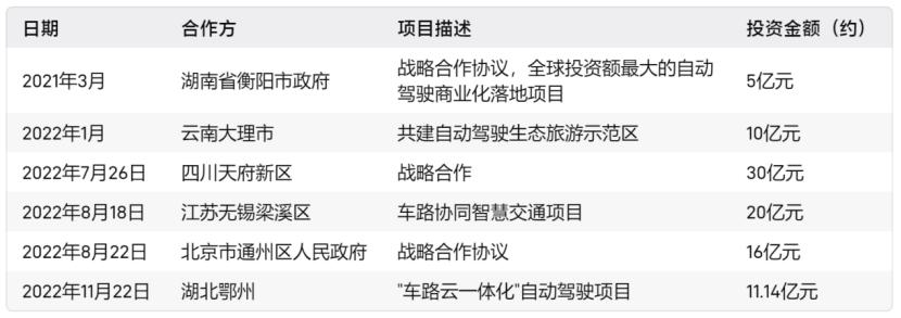 蘑菇车联和前两年相比,拿项目的速度也明显慢了。天眼查显示, 蘑菇车联成立于2018年,自主研发了行业首个“车路云一体化”自动驾驶系统。前两年蘑菇车联的动作几乎都集中在一件事:和全国各地的城市签订合作,建设车路协同智能网联基础设施。比如改造路、提供车、建设云。在2022年底之前,蘑菇车联签约了超过100亿元的订单。但2022年之后,它脱下了“订单狂魔”的面具。而这个时候,正是小米、华为等车企,以及百度等自动驾驶企业,掀起新一轮自动驾驶热潮的时机。