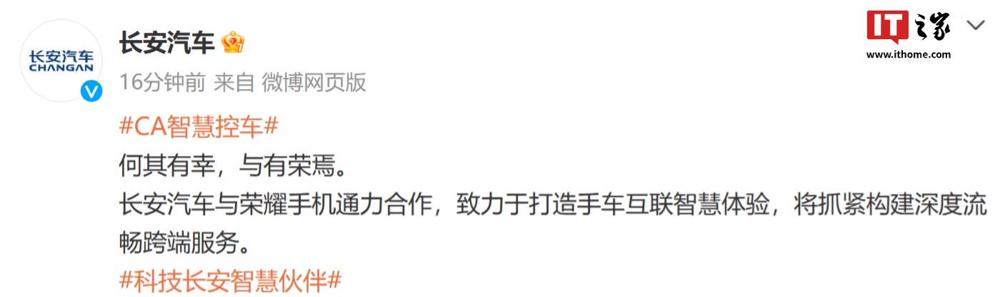 IT之家 10 月 25 日消息,长安汽车今日宣布,与荣耀手机合作,打造手车交互互联智慧体验,将抓紧构建深度流畅跨端服务。
