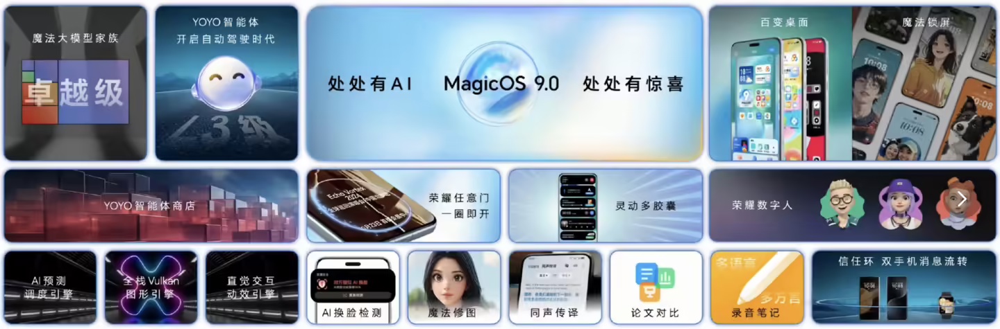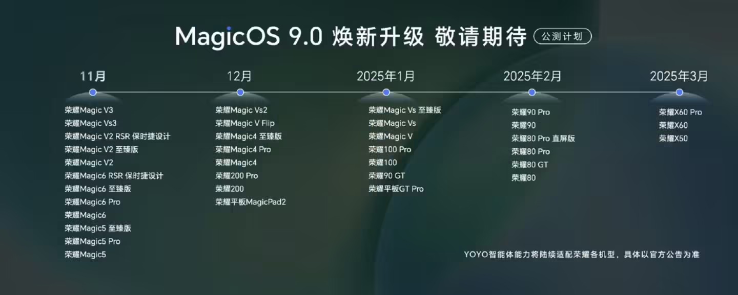 荣耀 MagicOS 9.0 发布于 10 月 23 日,该版本系统主要升级了 AI 功能及系统交互细节,主打 HONOR AI“YOYO 智能体”,将于 11 月起向各大机型陆续推送。