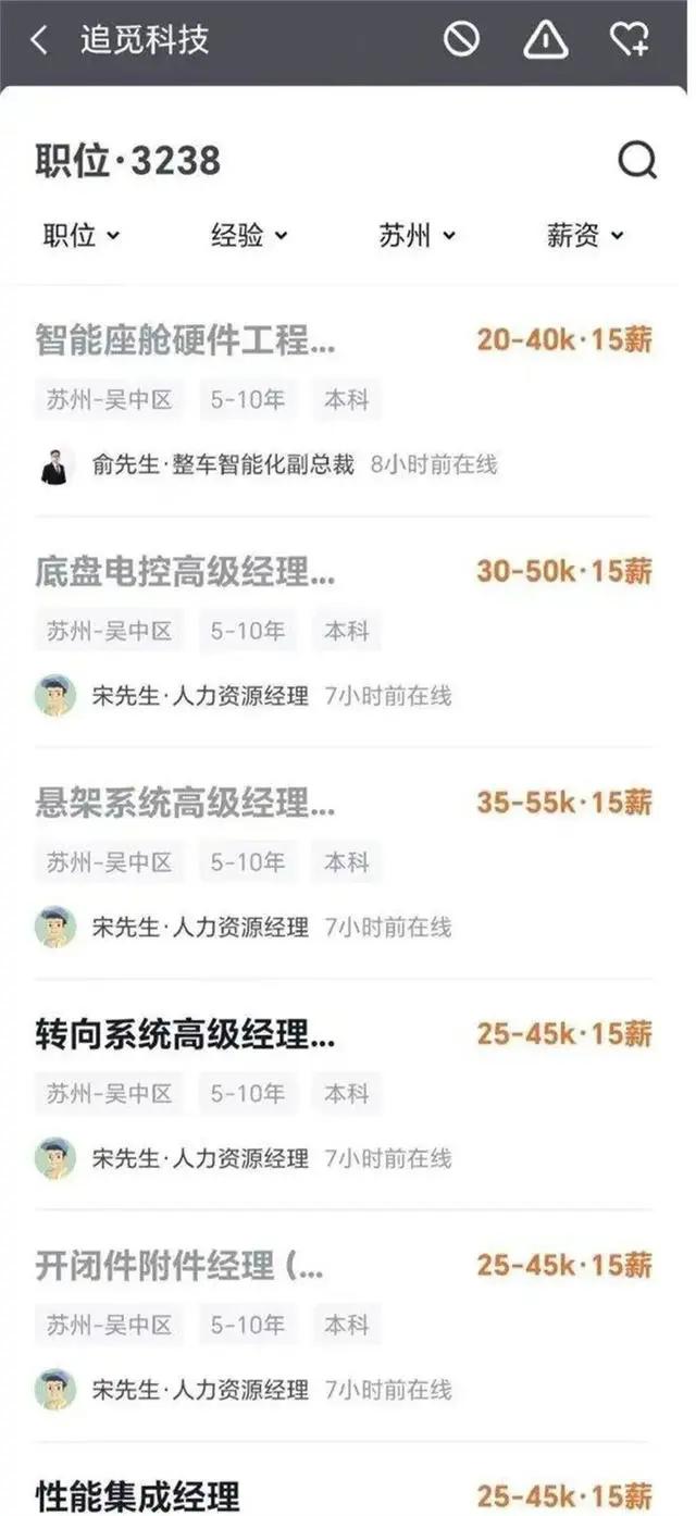 今年7月,网上传出追觅正在招聘智能座舱硬件工程师、底盘电控高级经理、悬架系统高级经理等汽车行业相关人才,最高开出了超5万元的月薪。