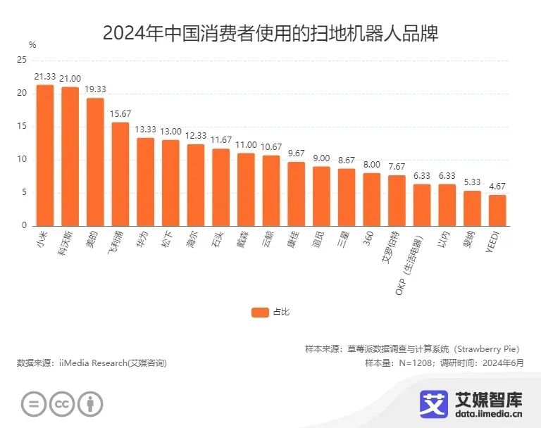 iiMedia Research(艾媒咨询)数据显示,2024年中国消费者使用的扫地机器人品牌中,排名前五的品牌依次为小米(21.33%)、科沃斯(21.00%)、美的(19.33%)、飞利浦(15.67%)和华为(13.33%),松下、海尔、石头与戴森紧随其后。
