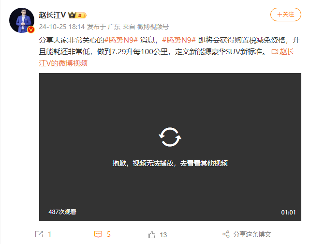 比亚迪腾势销售事业部总经理赵长江表示,腾势 N9 将会获得购置税减免资格,并且能耗还非常低,做到 7.29 升每 100 公里,定义新能源豪华 SUV 新标准。