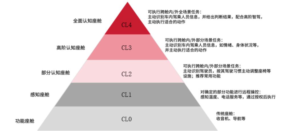 去年中国汽车工程学会发布的《汽车智能座舱分级与综合评价》白皮书对智能座舱进行定义,参照了自动驾驶的5个等级划分,CL0功能座舱、CL1感知智能座舱、CL2部分认知智能座舱、CL3高阶认知智能座舱、CL4全面认知智能座舱5个级别。等级越高,智能座舱的主动交互能力越强、服务内容越丰富、应用场景越广泛。