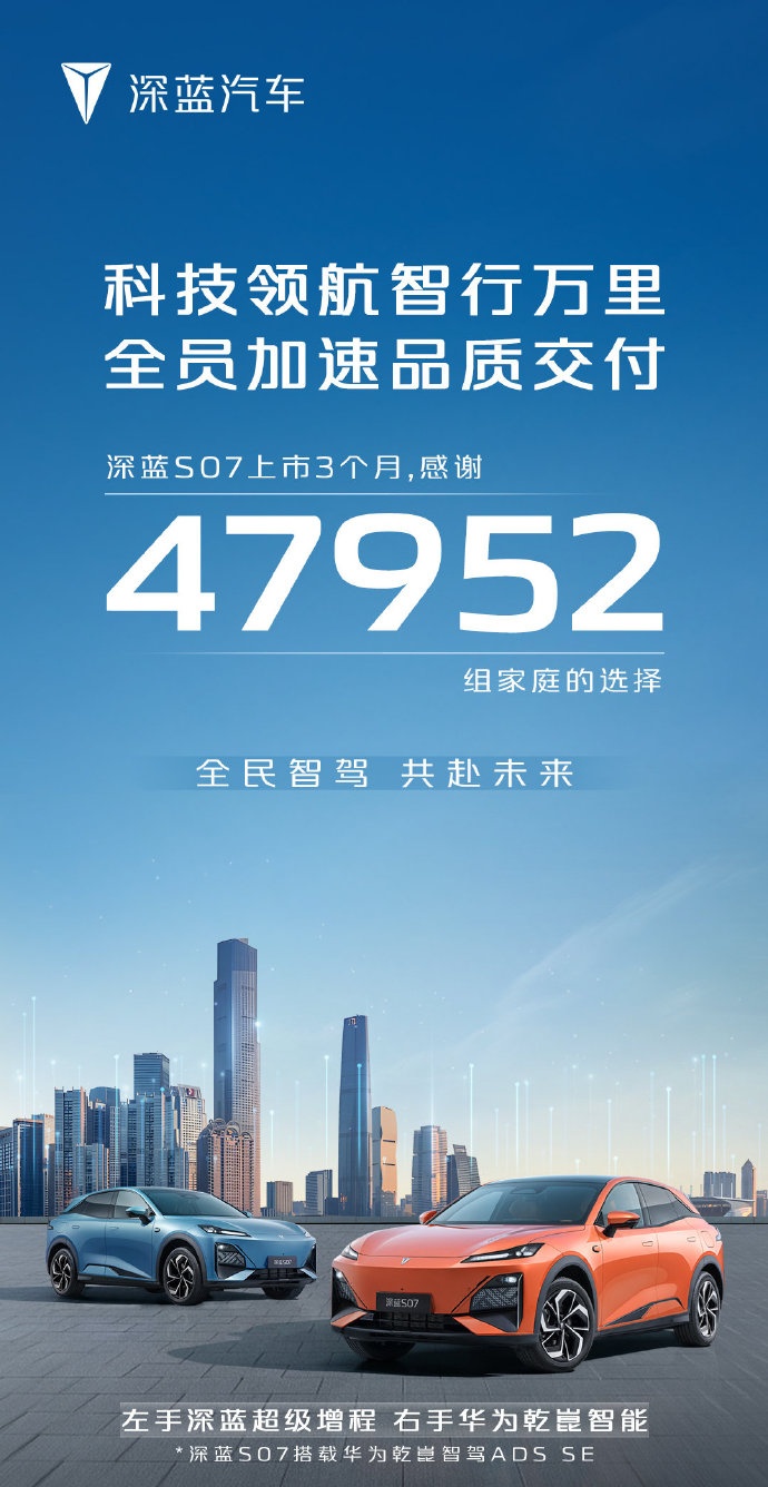IT之家 10 月 25 日消息,长安旗下深蓝汽车今日宣布,深蓝 S07 上市 3 个月订单达成 47952 辆。这款 SUV 于今年 7 月上市,售价区间为 14.99-20.79 万元,提供纯电和增程两种版本,部分车型搭载华为乾崑智驾辅助系统。