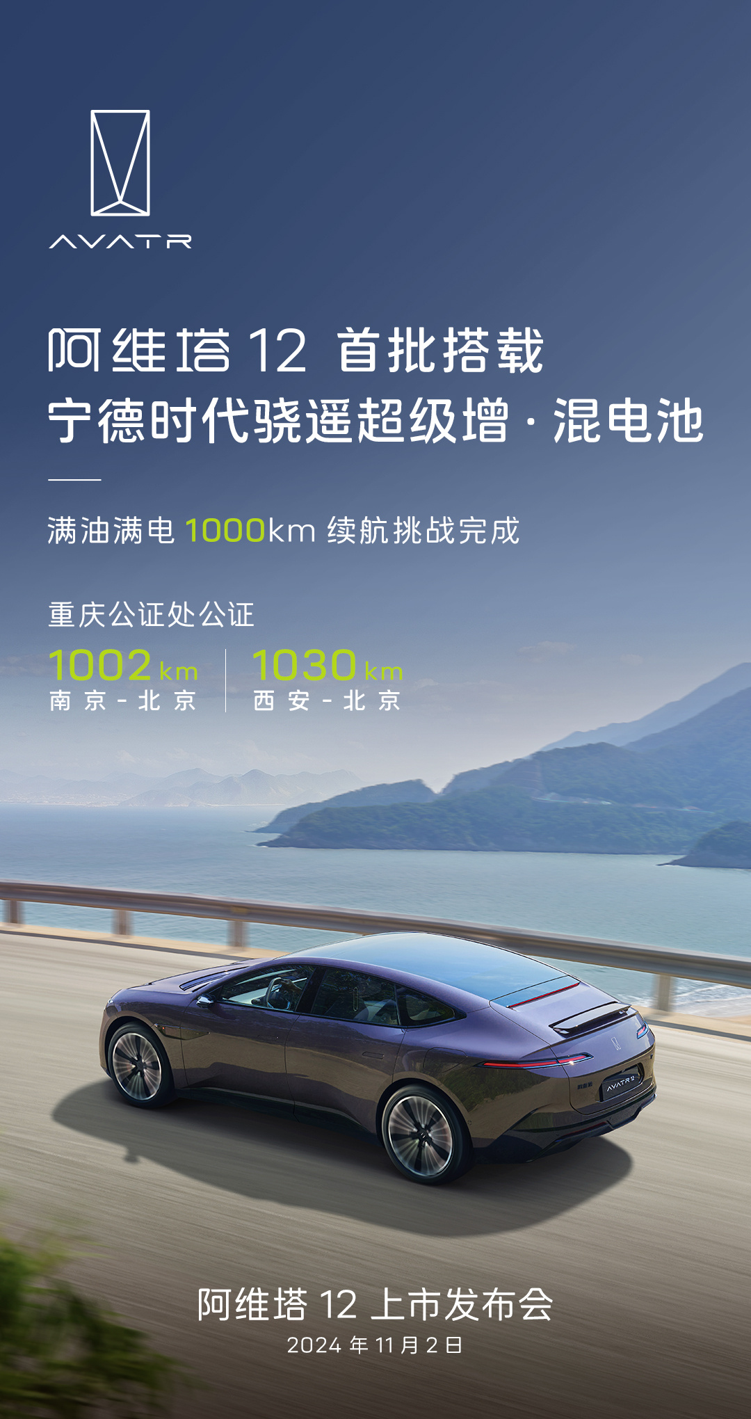 阿维塔官方昨日发文宣布,阿维塔 12 增程版轿车将首批搭载宁德时代骁遥超级增・混电池。重庆公证处公证,该车从南京到北京(1002km)/从西安到北京(1030km)满油满电 1000km 续航挑战完成。