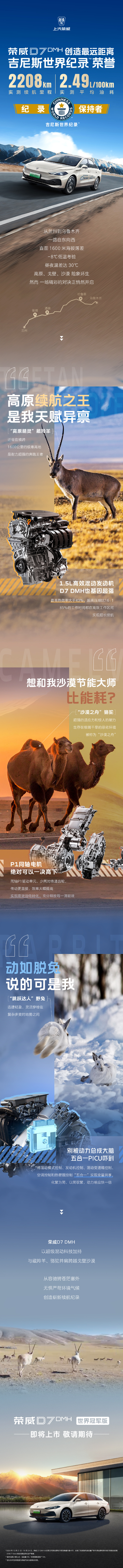 IT之家 10 月 28 日消息,IT之家从上汽荣威官微获悉,上汽荣威 D7 DMH 吉尼斯世界纪录挑战赛近日在乌鲁木齐圆满结束。荣威 D7 DMH 世界冠军版凭借超过 2208.719 公里的续航表现及仅为 2.49L / 100km 的平均油耗,成功夺得“插电式混合动力轿车单次满油满电行驶最远距离”的吉尼斯世界纪录。