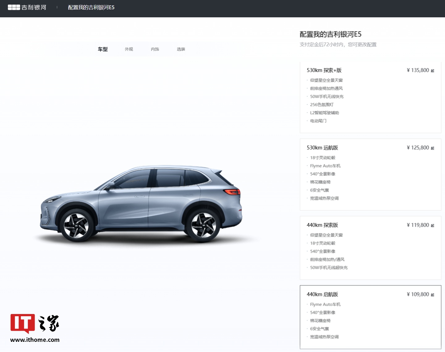 关于吉利银河 E5 的配置,IT之家此前进行了详细报道。该车于今年 8 月 3 日上市,售价 10.98 万元起。