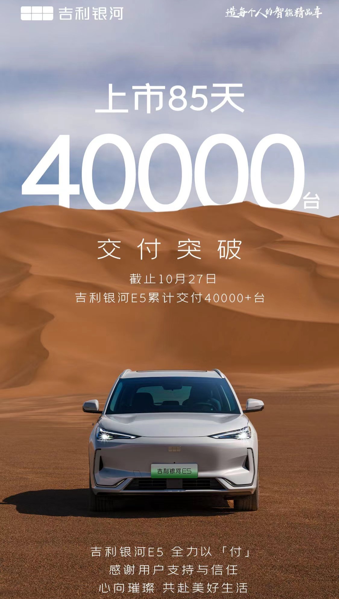 IT之家 10 月 28 日消息,吉利汽车今天宣布,截止 10 月 27 日,银河 E5 汽车上市 85 天累计交付量突破 4 万台。