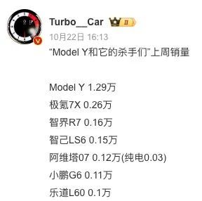 但也有汽车博主自行收集统计“Model Y和它的杀手们”周销量,从中也能感受到Model Y依旧保持着“网上没赢过销量没输过”的风采。