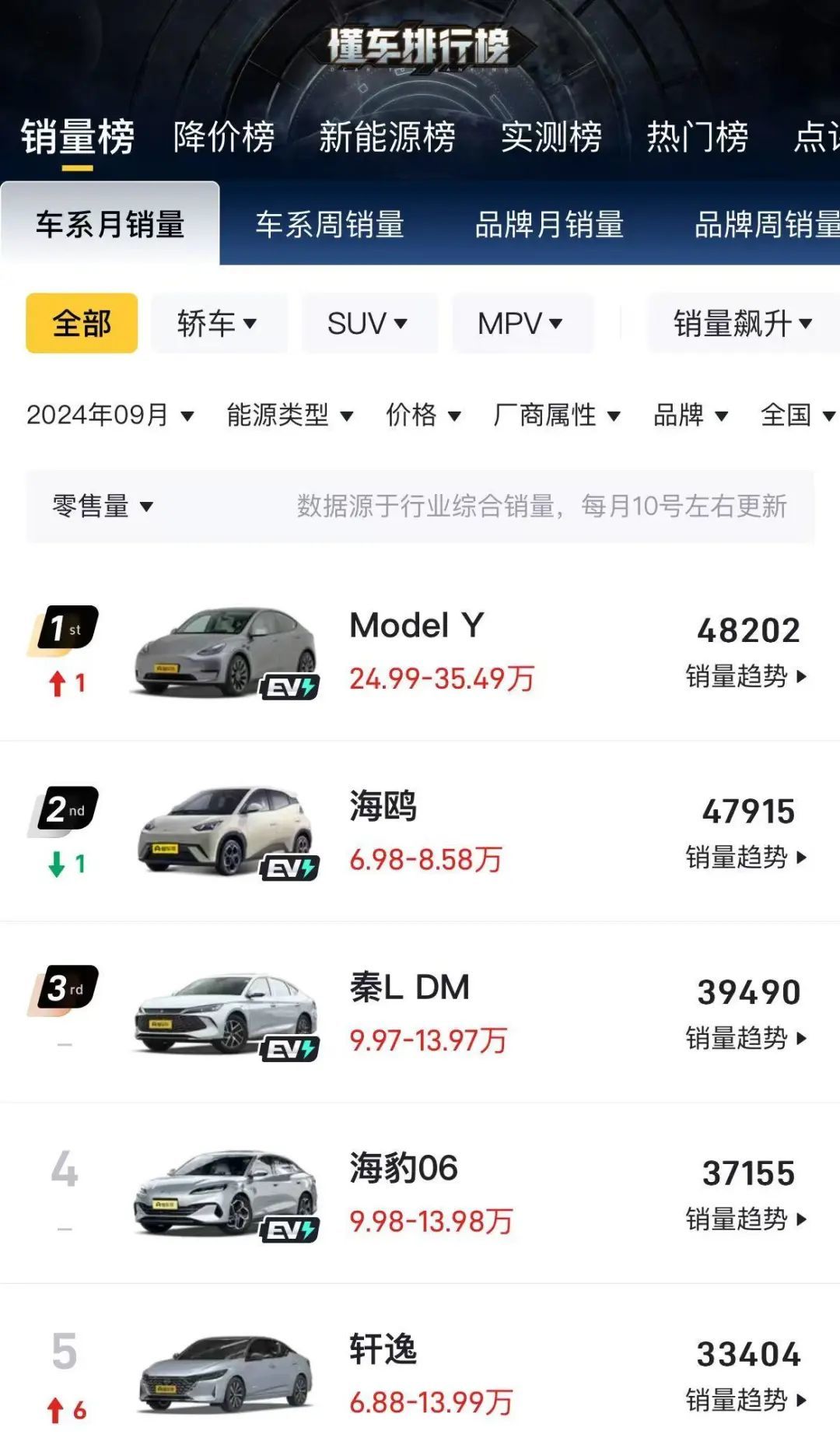 懂车帝显示,在9月零售量排行榜上,Model Y以48202辆的销量夺得第一,这个“第一”的含金量在于不限车型、不限能源类型、不限价格区间,几乎是无差别屠杀,第二名是售价6.98万元起的比亚迪海鸥,第三名是号称工业奇迹续航2100公里的秦L DM。