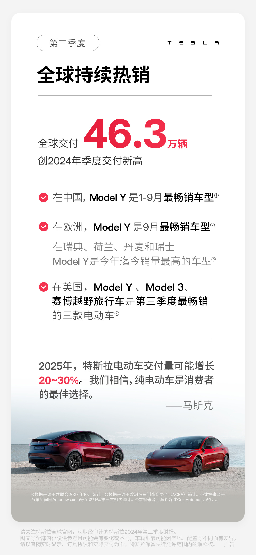 IT之家 10 月 28 日消息,特斯拉官方今日宣布,2024 年第三季度全球交付 46.3 万辆电动车,创季度交付新高:
