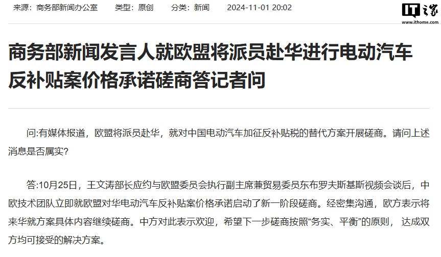 IT之家 11 月 1 日消息,商务部新闻发言人今日就欧盟将派员赴华进行电动汽车反补贴案价格承诺磋商答记者问。