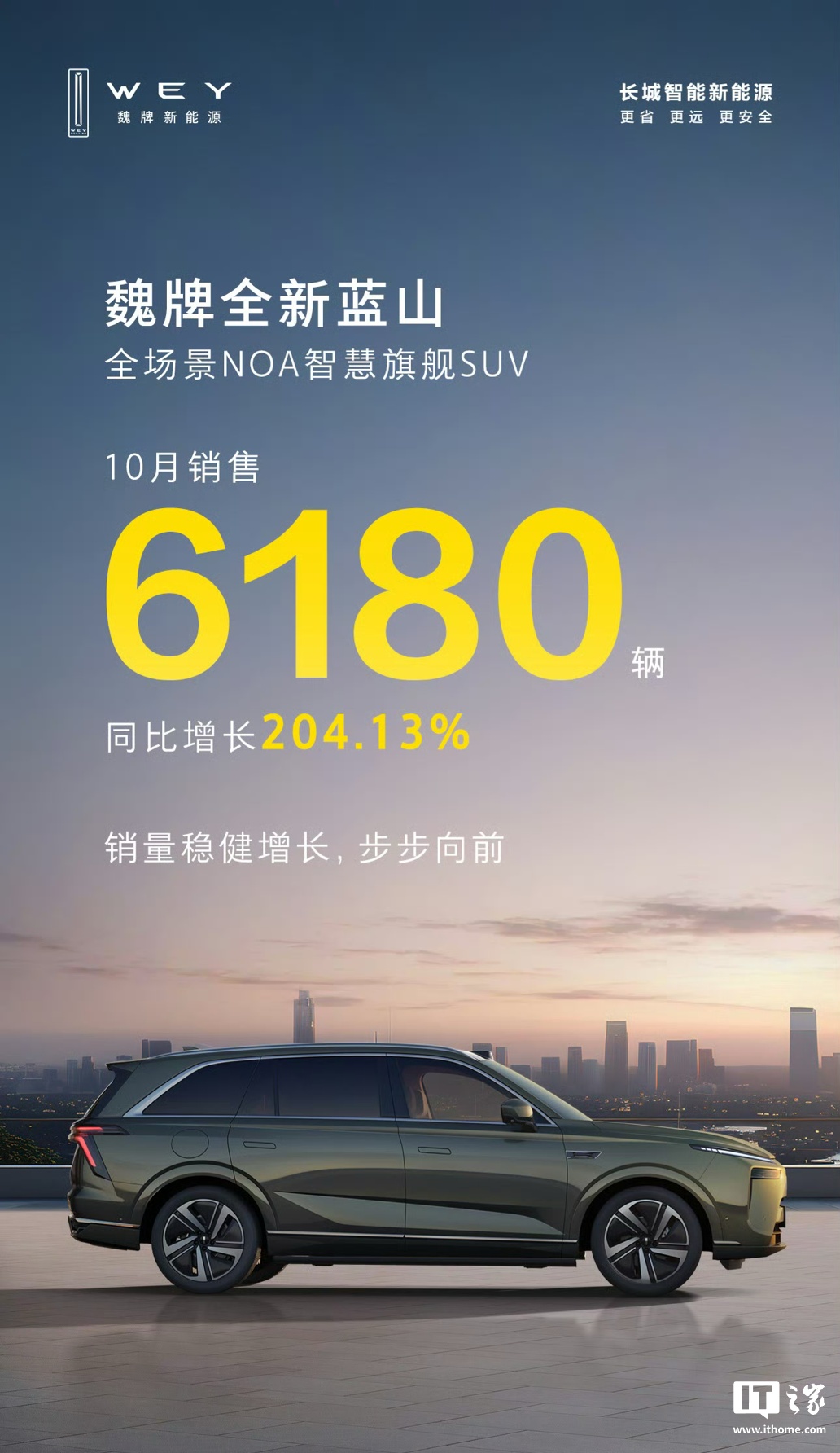 IT之家 11 月 2 日消息,长城汽车 1 日晚间宣布,旗下车型“全场景 NOA 智慧旗舰 SUV”魏牌全新蓝山 10 月取得 6180 辆的销量,同比增长 204.13%。