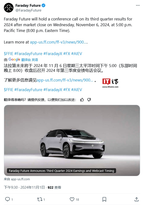 法拉第未来还宣布将于太平洋时间 2024 年 11 月 6 日星期三下午 5 点(IT之家注:北京时间 7 日早上 8 点)收盘后,召开 2024 年第三季度业绩电话会议。