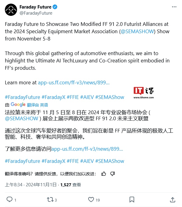 IT之家 11 月 2 日消息,法拉第未来(Faraday Future)于 10 月 31 日发布公告,宣布将出席 11 月 5~8 日在美国拉斯维加斯举办的 SEMA 改装展,展示两款改装的 FF 91 2.0 Futurist Alliance 电动车。