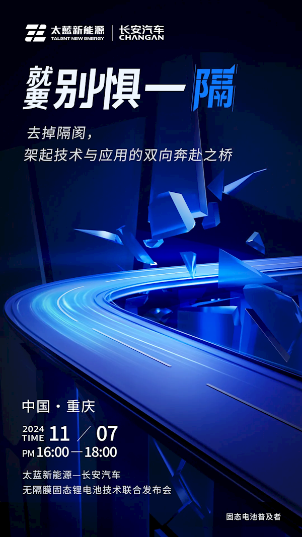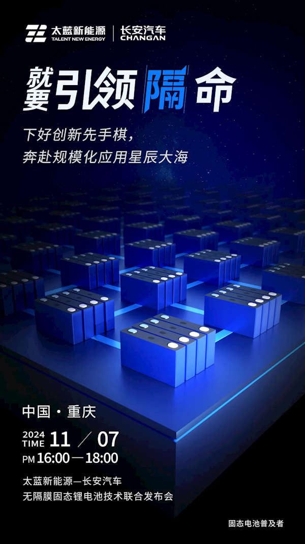 快科技11月2日消息,太蓝新能源宣布,将联合长安汽车于11月7日举办无隔膜固态锂电池技术联合发布会。