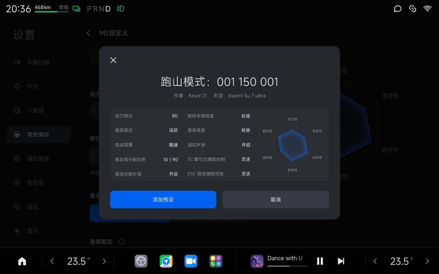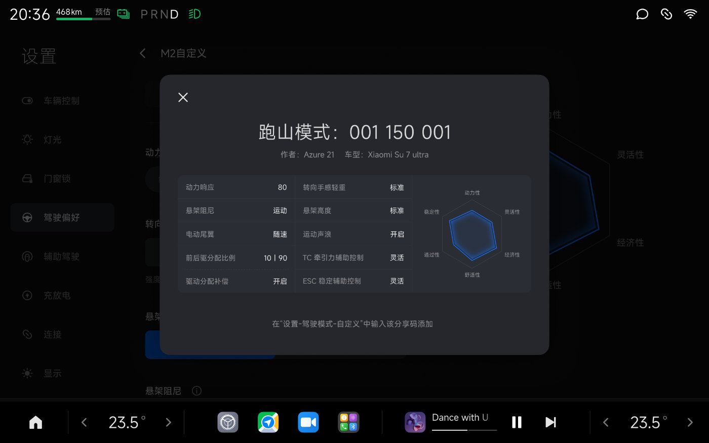 在小米 SU7 MAX 车型上,提供了丰富的自定义驾驶参数设置。升级了 1.4.0 之后,可以将自己定义的驾驶模式通过分享码分享给其他小米 SU7 MAX 车友。在设置-驾驶偏好中,点击 M1 或者 M2 模式,点击分享图标,可以生成该模式的 9 位分享码和性能参数简报。