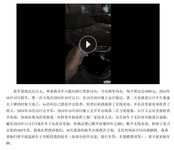 据投诉车主介绍,他新提车还不到一个月,前天还在行驶,停放一晚上后,就出现了电瓶亏电无法启动的情况。