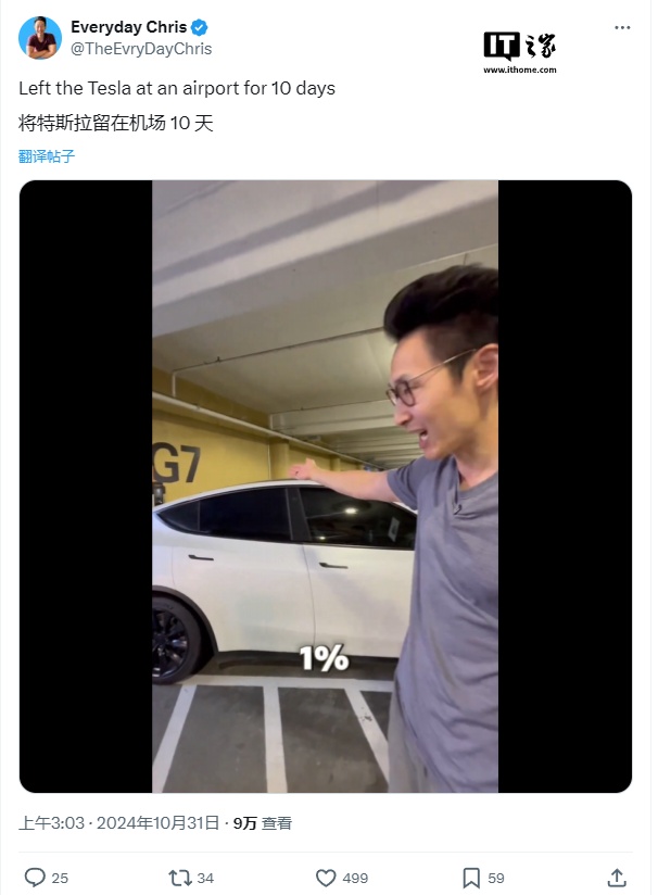 据 X 平台用户、Model Y 车主 @theevrydaychris 称,他将自己的 Model Y 停放在机场停车场 10 天,机场的 ChargePoint 充电器无法使用,出发前往新加坡前,车辆剩余 80% 的电量。